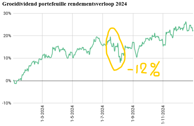 Laten we dit vergelijken met een situatie uit vorig jaar. Eind juli 2024 was er een correctie van -12%, maar omdat mijn portefeuille toen al +20% in de plus stond, zakte het rendement terug naar 8%. Dat voelt als een stap terug, maar niet als een ramp. Als dezelfde daling plaatsvindt wanneer je rendement op 0% staat, dan duikt het rendement ineens naar -12%. Psychologisch gezien voelt dat als een veel grotere klap, terwijl de procentuele daling exact hetzelfde is.